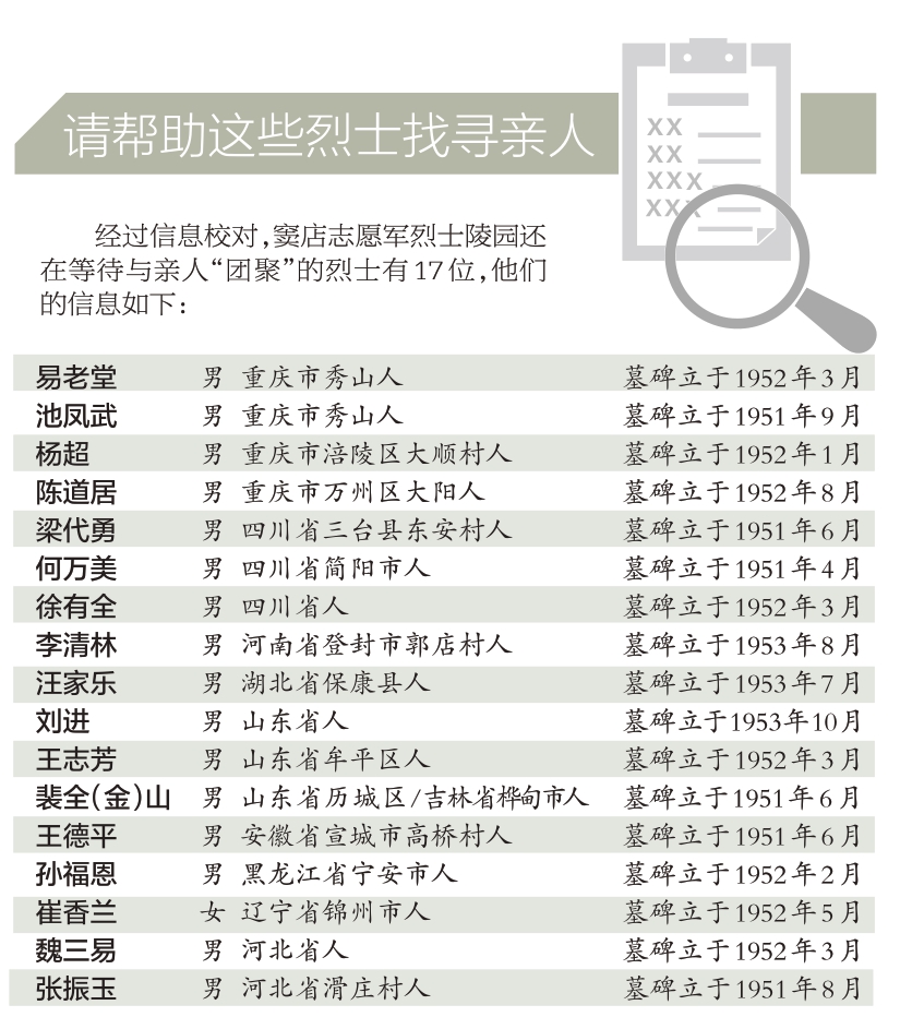 又是一年清明节,房山区窦店志愿军烈士陵园的烈士墓前摆满了鲜花。这些长眠于此70多年的烈士中,有的人至今没有等来亲人祭扫。近期,本报记者通过与房山区退役军人事务局、各地相关部门及志愿者的共同努力,帮助部分烈士寻亲成功,但仍有17位烈士的忠魂在等待与亲人“团聚”。
