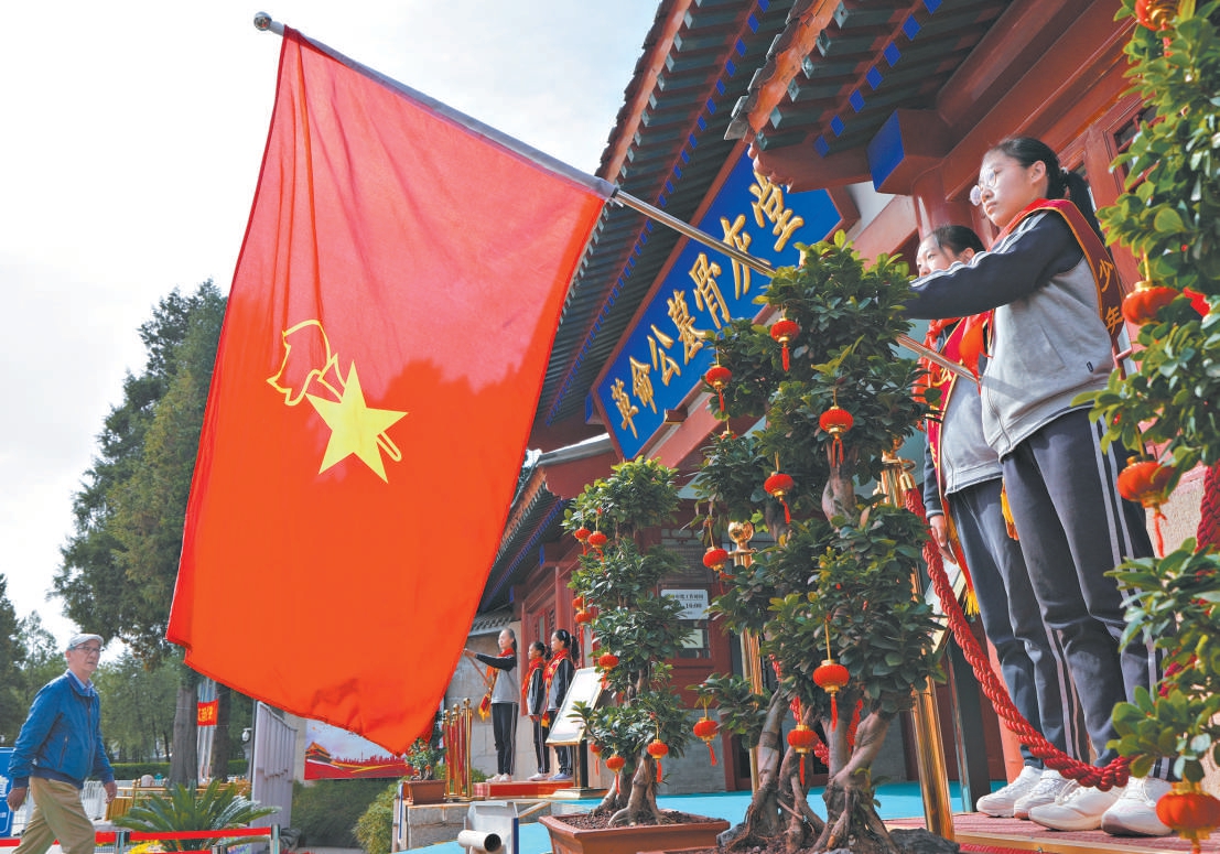 “红领巾心向党 我为英烈来站岗”活动中学生们为英烈站岗。