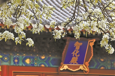 作为北京保存完整的明代木结构建筑群,智化寺梨花已成为年度赏花名片。两株古梨树如期盛放,雪白梨花缀满枝头,与红墙、古刹相映成趣。最佳观赏期将持续至4月初。摄影/本报记者 杨益
