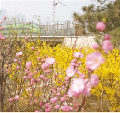 梅花、玉兰、山桃、迎春、海棠等各色花卉次第绽放,把城市副中心装点得烂漫多姿。图为高铁从北京通州站北侧的花海中驶过。摄影/本报记者 黑建军