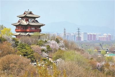 北京园博园迎来双花最佳观赏期。鹰山脚下的桃花谷内,山桃花漫山绽放,粉白如云;永定塔周边的连翘林也同步盛放,明黄满枝,两种春色在园区内交织成景。摄影/本报记者 杨益