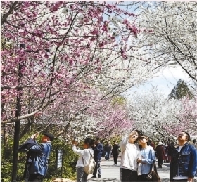 桃花大道繁花缀枝、春意盎然。灿若霞光的品虹桃、品霞桃,与洁白如玉的白花山碧桃交相呼应,为游客呈现出一幅芳菲画卷。摄影/本报记者 袁艺