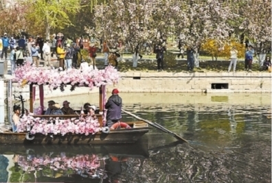 海棠花溪摇橹船正式开船,游客可泛舟水上,穿行于海棠花海,感受水影花色的独特韵味。花期持续至4月中下旬。摄影/本报记者 魏彤