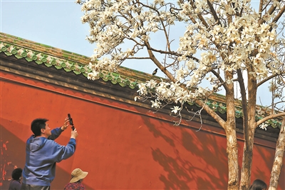 天坛斋宫迎来春日限定美景。玉兰盛放,洁白繁花与朱红宫墙、翠绿琉璃瓦交织,成为市民踏青寻芳的热门打卡点。摄影/本报记者 杨益 本版统筹/郝羿