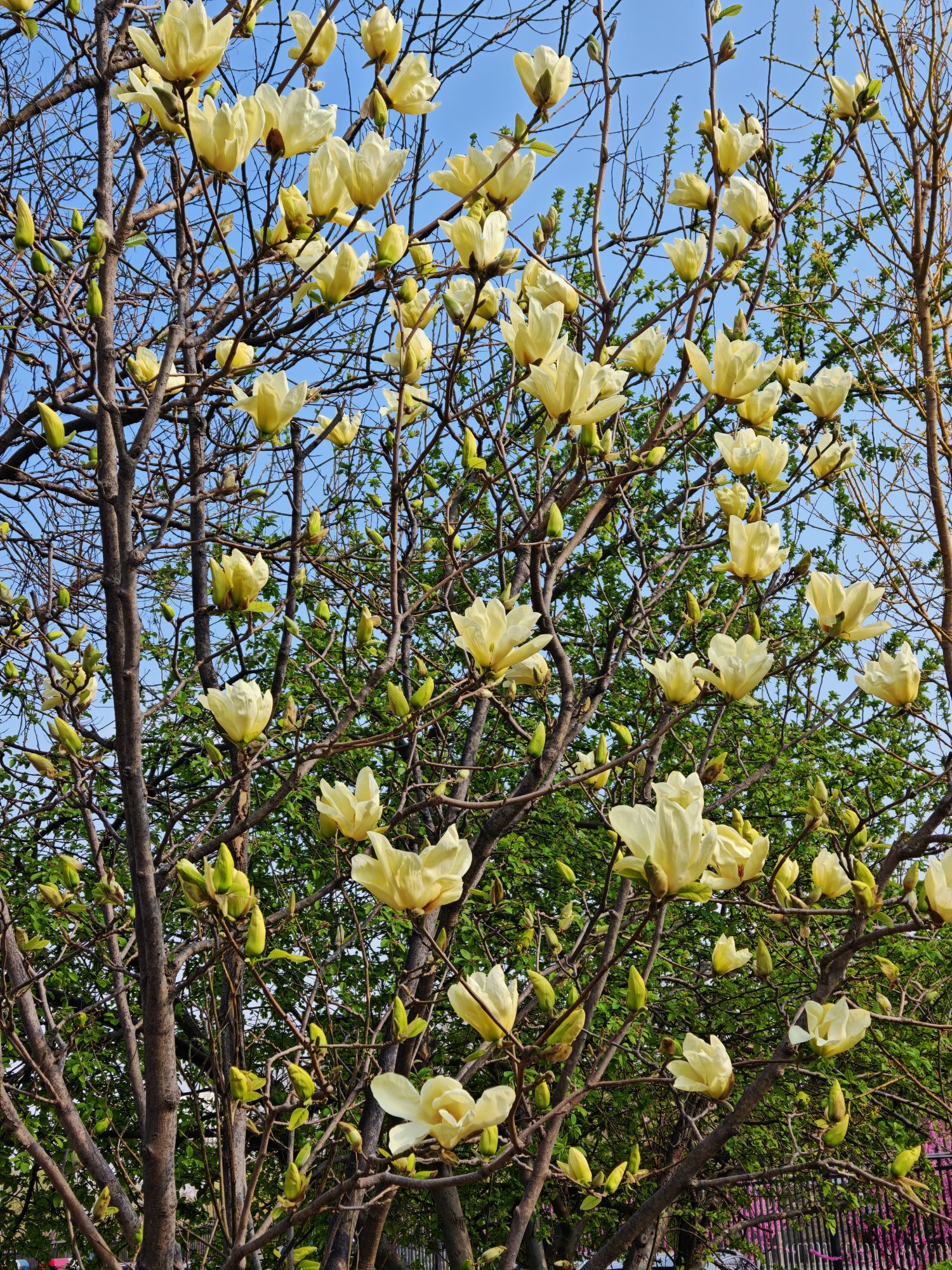 从浅粉到玫瑰红,再到深紫红,玉兰的颜色可谓丰富,除此之外,还有一种黄色系列的木兰,比如“黄鸟”玉兰,花期晚,花叶同放,是黄花品种中的代表。北京城市绿化中还能见到一种叫 “飞黄”玉兰的黄色品种,市民在散步时,不妨多留意一下,也许就能偶遇这一树亮眼的暖黄。