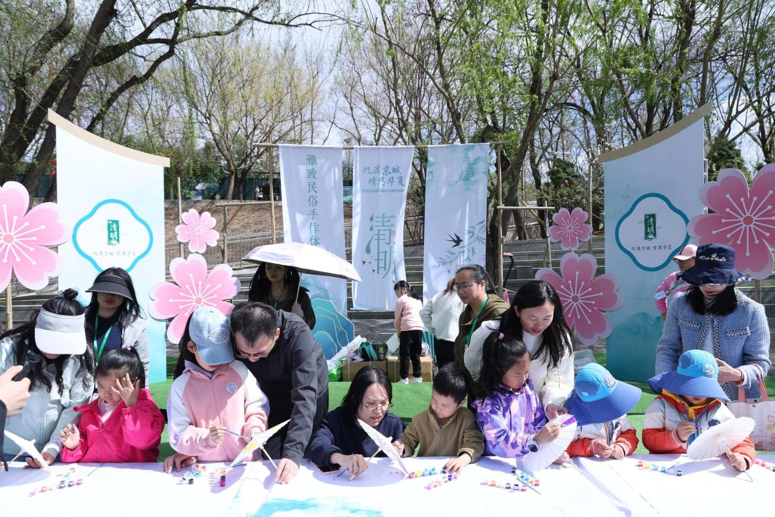 当天,雁栖湖景区电瓶船木栈道变身民俗手作体验区。诗词漆扇、油纸伞、纸鸢、茉莉花驱蚊手串、艾草香囊五项手工制作免费开放,每项活动组织1至2组,每组10到12个名额,采取排队取号预约形式,每组体验约20分钟。不少家长带着孩子一起动手,在素面漆扇上绘制清明诗词,在风筝上写下春日寄语。