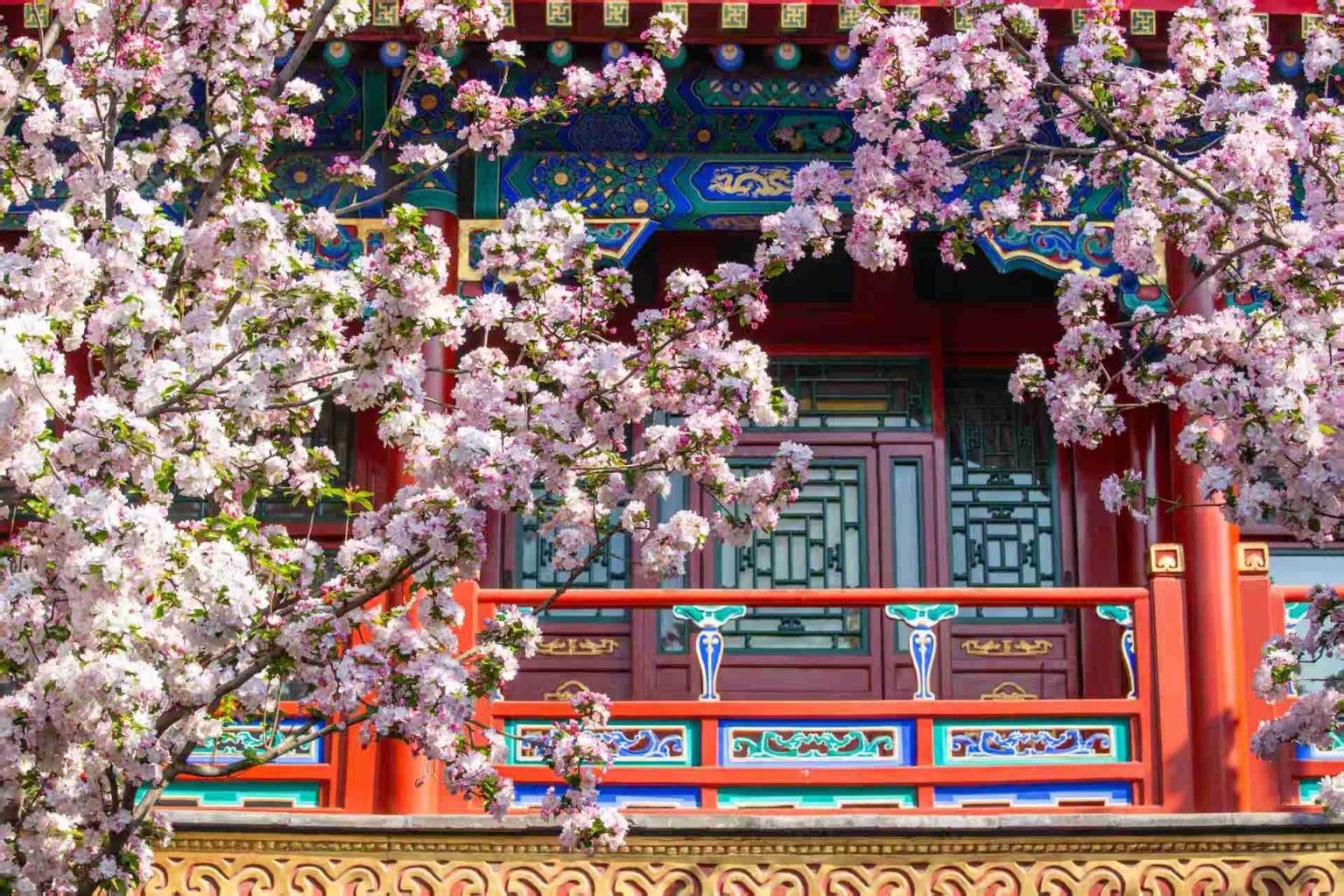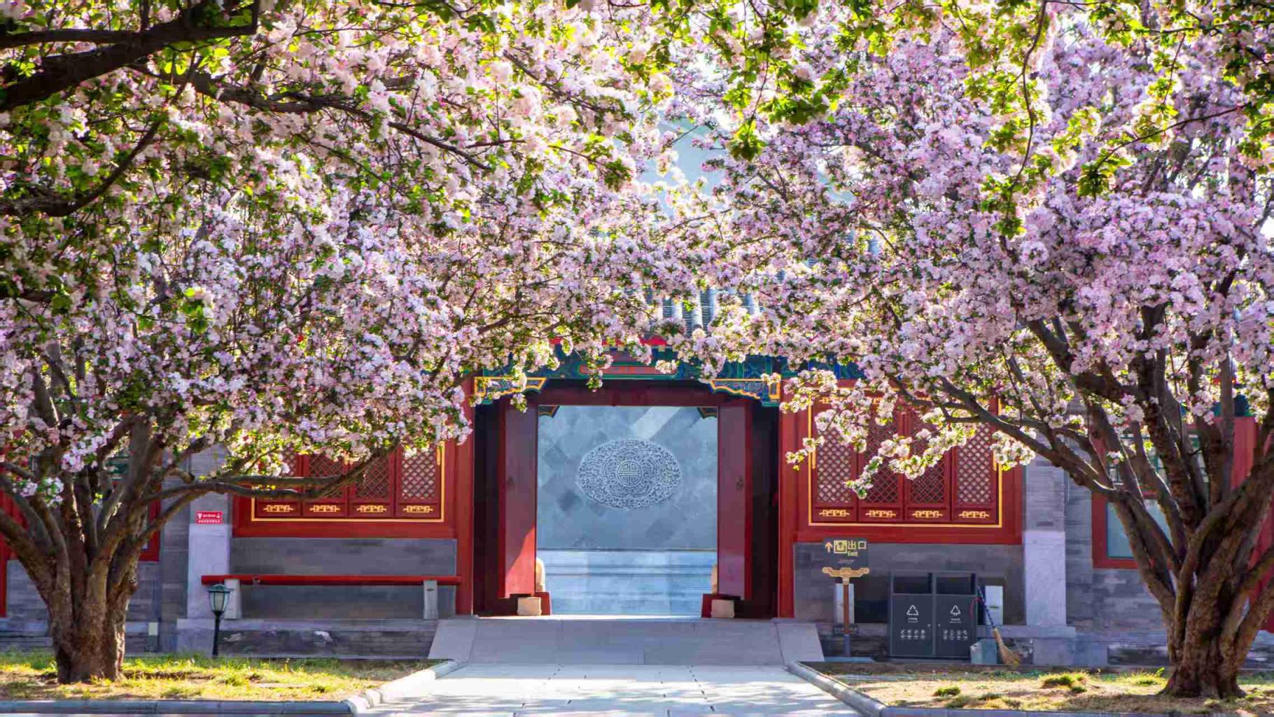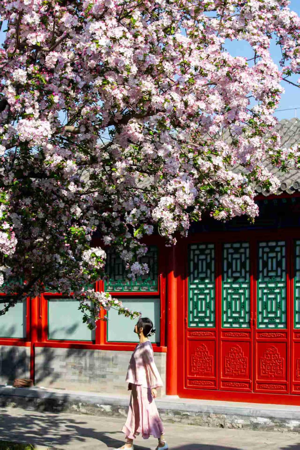 恭王府海棠花开,粉白的花海,朱红的门窗,青绿色彩画,灰砖的墙体完美融合,一幅幅中式美学画卷,吸引大量游客前来赏花。