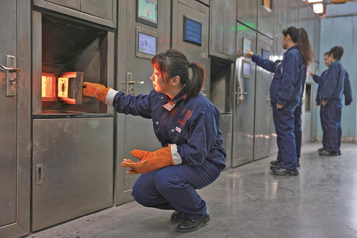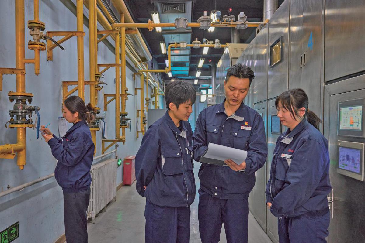 2月27日,八宝山殡仪馆火化车间,女工们在检查炉内情况。