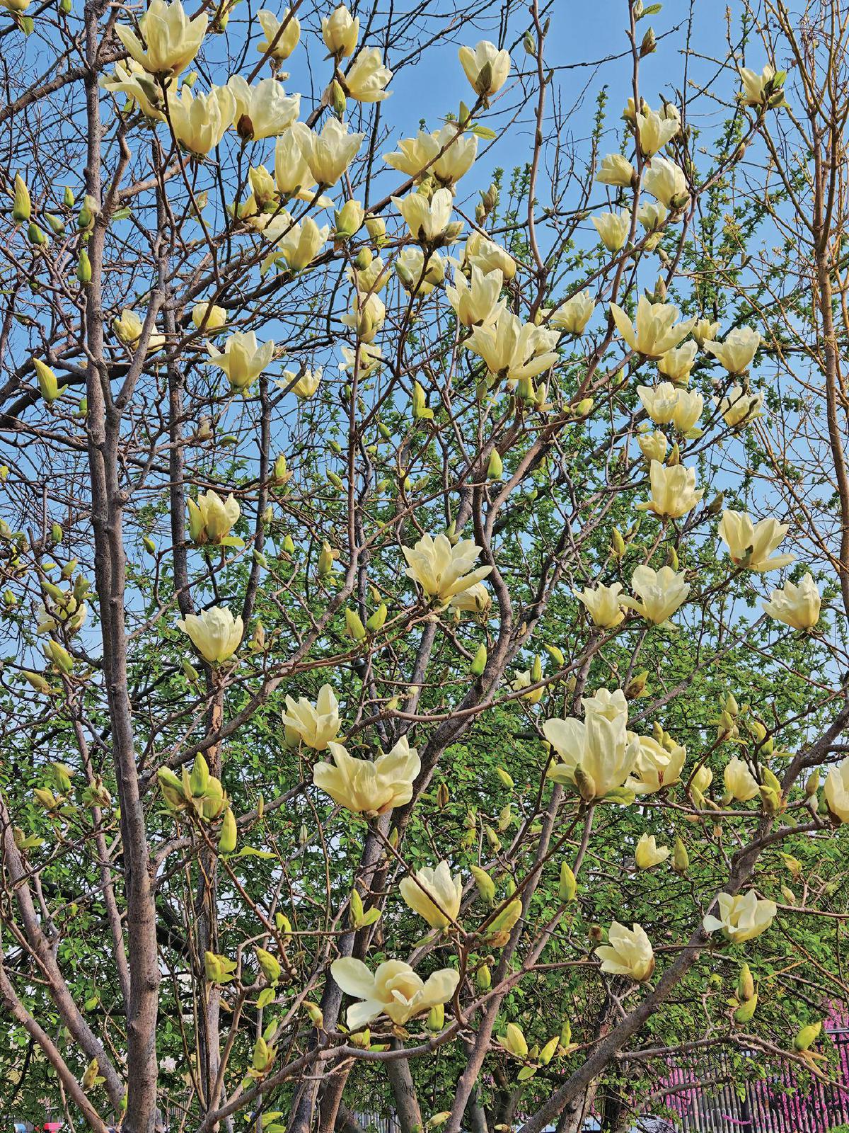 玉兰花颜色有白、粉、红、黄。从浅粉到玫瑰红,再到深紫红,玉兰的颜色可谓丰富,除此之外,还有一种黄色系列的木兰,比如“黄鸟”玉兰,花期晚,花叶同放,是黄花品种中的代表。北京城市绿化中还能见到一种叫“飞黄”玉兰的黄色品种,市民在散步时,不妨多留意一下,也许就能偶遇这一树亮眼的暖黄。