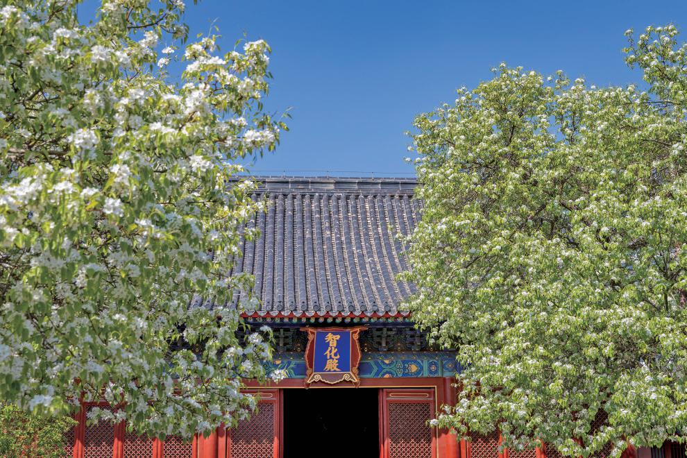 智化寺的梨花凭借清雅古韵,被称为赏梨花“天花板”。粗壮的梨树舒展虬劲,洁白的花簇如积雪般压满枝头,形成绝美的“花瀑”,与寺院古朴的红墙相互映衬。工作人员表示,两株梨树虽颇有年头,但并不是树龄百年以上古树,暂未请园林专家鉴定过品种。