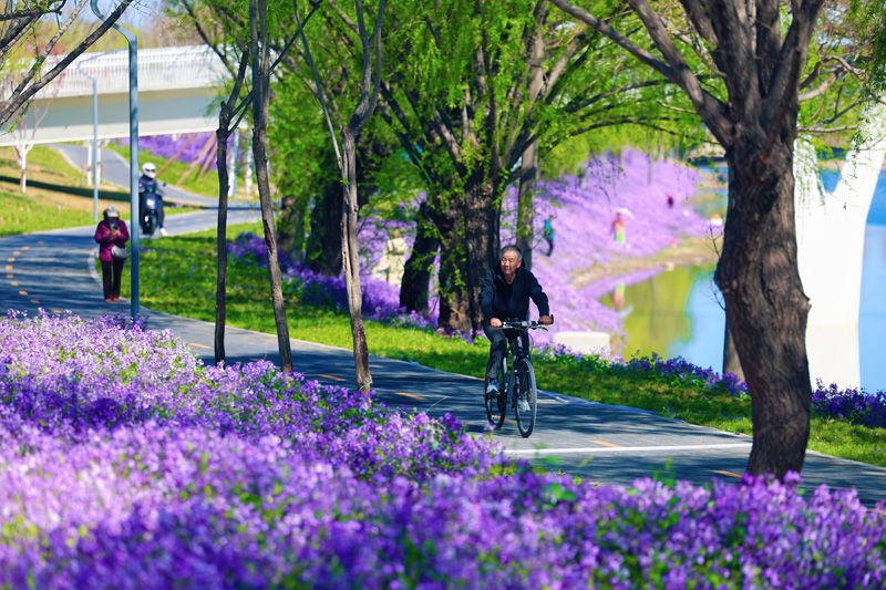 市民骑行在二月兰温柔包裹的紫色长廊中。