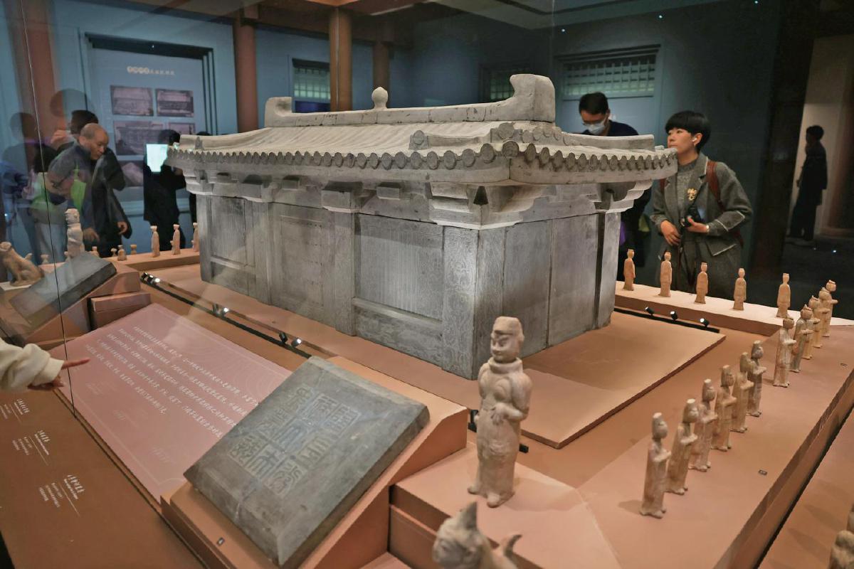 李静训石棺(复制品)、墓志和出土陶俑。摄影/新京报记者 浦峰
