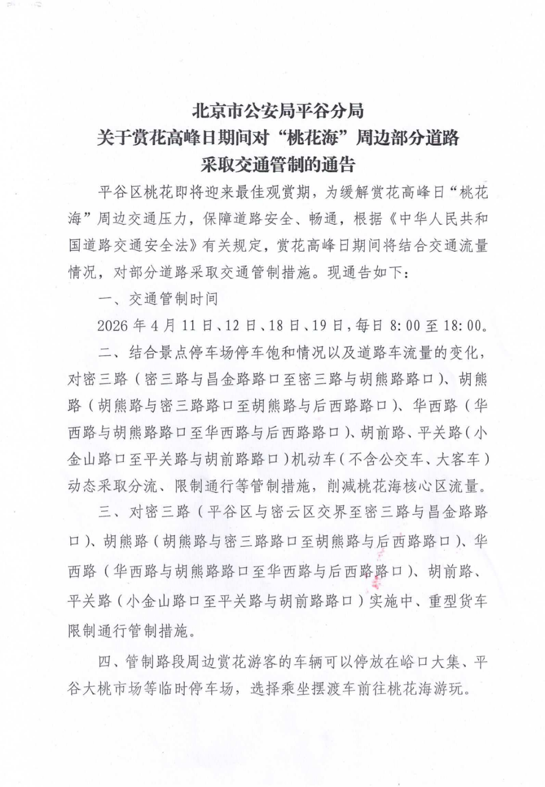三、对密三路(平谷区与密云区交界至密三路与昌金路路口)、胡熊路(胡熊路与密三路路口至胡熊路与后西路路口)、华西路(华西路与胡熊路路口至华西路与后西路路口)、胡前路、平关路(小金山路口至平关路与胡前路路口)实施中、重型货车限制通行管制措施。