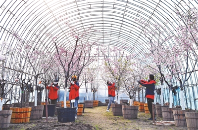 工作人员为促培大棚内的樱花修枝
