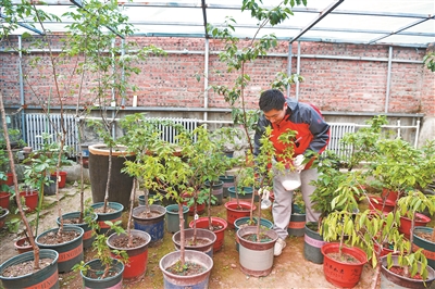 赵翊舜对促培大棚内的樱花进行修枝