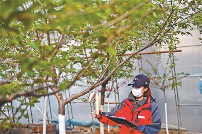 工作人员正在促培大棚内记录樱花的生长情况
