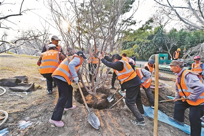 工作人员将培育好的樱花树移栽到园内