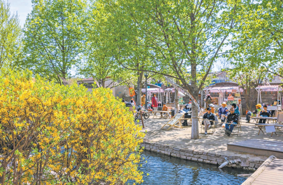 临水的咖啡馆旁花开得热闹,花团锦簇,也带火了咖啡馆的生意。北京日报记者 潘之望摄