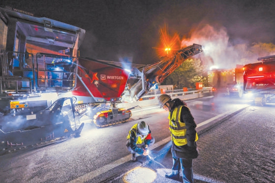 今天(11日)凌晨,四元桥启动翻建修复工程,施工设备铣刨沥青面层,整体破拆旧铺装。本报记者 邓伟摄