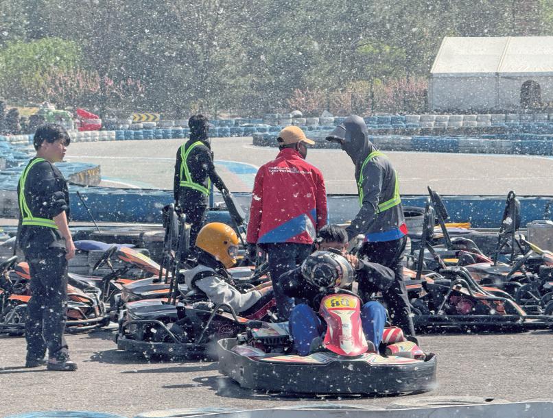 4月11日,新港卡丁车俱乐部(奥森店),年轻人冒着杨柳絮进入赛道准备竞速。新京报记者 张鶯 摄