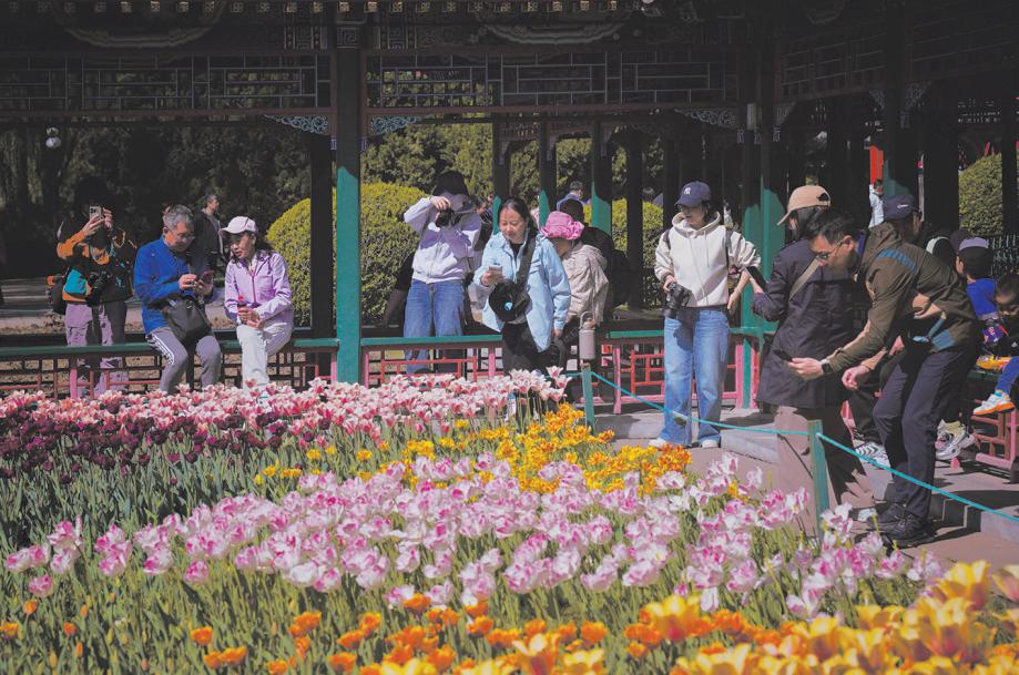 4月11日,中山公园,郁金香已全面进入盛花期,游客在公园赏花。