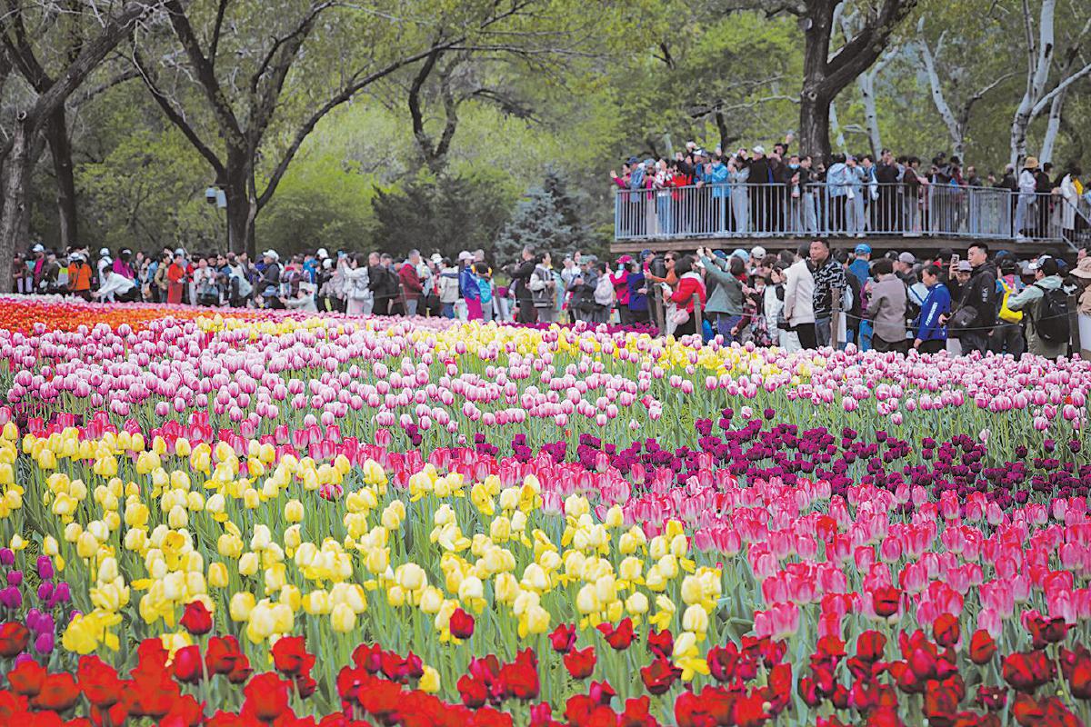 4月13日,国家植物园(北园),游客在郁金香花海游玩。 摄影/新京报记者 薛珺