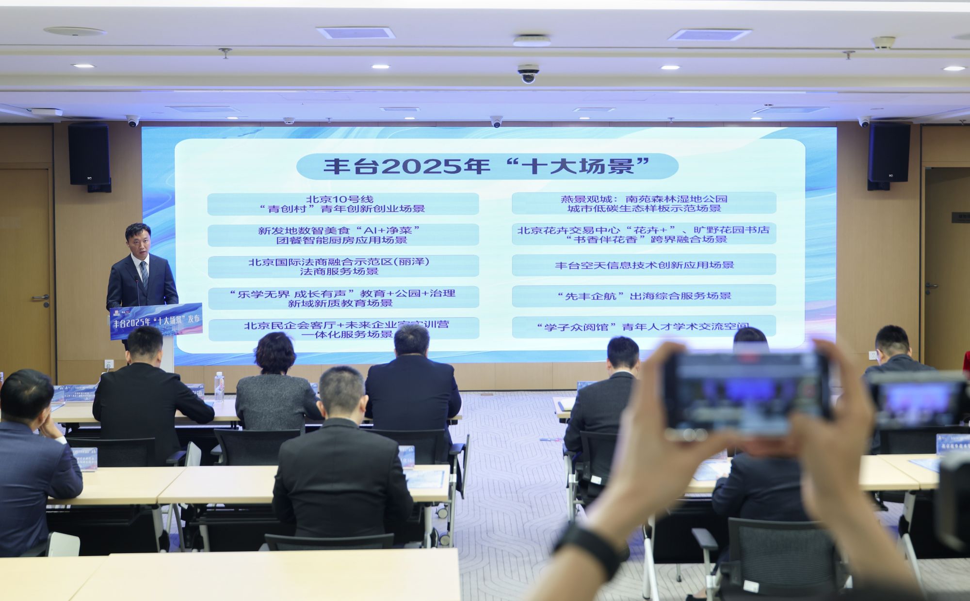 “十大场景”分别是:北京10号线青创村青年创新创业场景;新发地数智美食“AI+净菜”团餐智能厨房应用场景;北京国际法商融合示范区(丽泽)法商服务场景;“乐学无界 成长有声”教育+公园+治理新域新质教育场景;北京民企会客厅+未来企业家实训营一体化服务场景;燕景观城:南苑森林湿地公园城市低碳生态样板示范场景;北京花卉交易中心“花卉+”与旷野花园书店“书香伴花香”跨界融合场景;丰台空天信息技术创新应用场景;“先丰企航”出海综合服务场景;“学子众阅馆”青年人才学术交流空间。