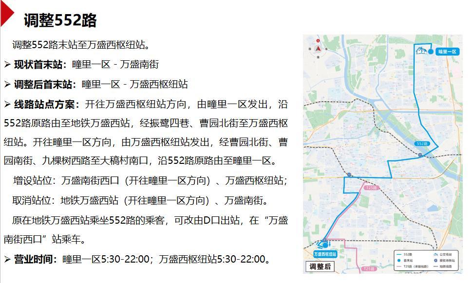 调整552路末站至万盛西枢纽站。开往万盛西枢纽站方向,由疃里一区发出,沿552路原路由至地铁万盛西站,经振鹭四巷、曹园北街至万盛西枢纽站。开往疃里一区方向,由万盛西枢纽站发出,经曹园北街、曹园南街、九棵树西路至大稿村南口,沿552路原路由至疃里一区。原在地铁万盛西站乘坐552路的乘客,可改由D口出站,在“万盛南街西口”站乘车。