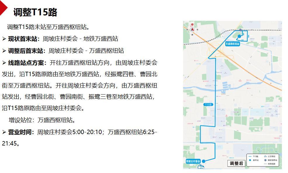 其中,调整T15路末站至万盛西枢纽站。开往万盛西枢纽站方向,由周坡庄村委会发出,沿T15路原路由至地铁万盛西站,经振鹭四巷、曹园北街至万盛西枢纽站。开往周坡庄村委会方向,由万盛西枢纽站发出,经曹园北街、曹园南街、振鹭三巷至地铁万盛西站,沿T15路原路由至周坡庄村委会。