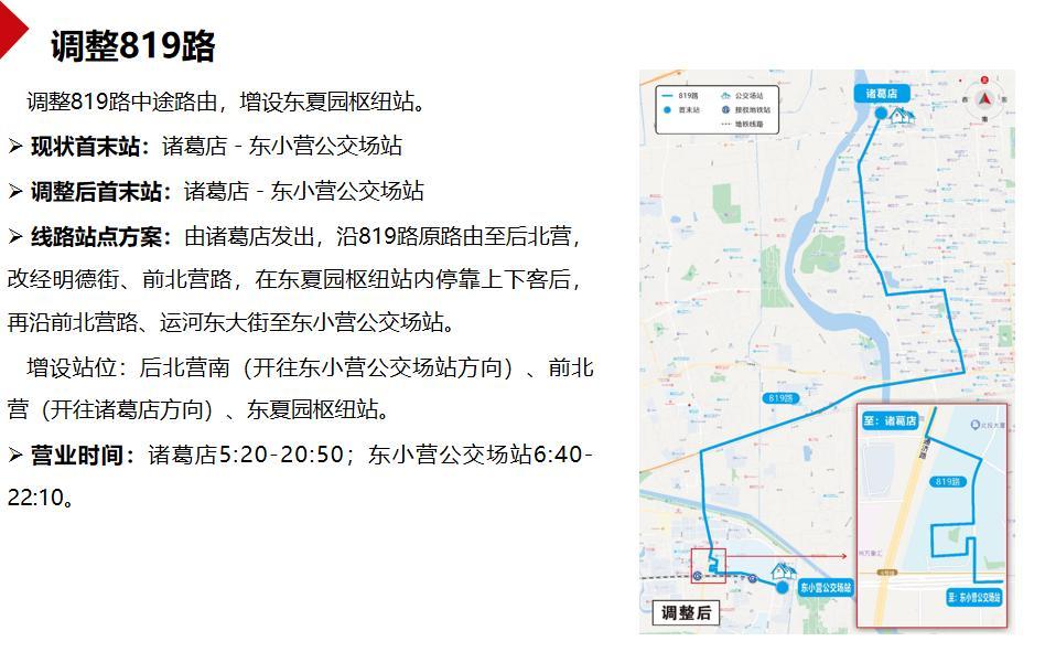 此外,调整819路中途路由,增设东夏园枢纽站。线路由诸葛店发出,沿819路原路由至后北营,改经明德街、前北营路,在东夏园枢纽站内停靠上下客后,再沿前北营路、运河东大街至东小营公交场站。增设后北营南(开往东小营公交场站方向)、前北营(开往诸葛店方向)、东夏园枢纽站。