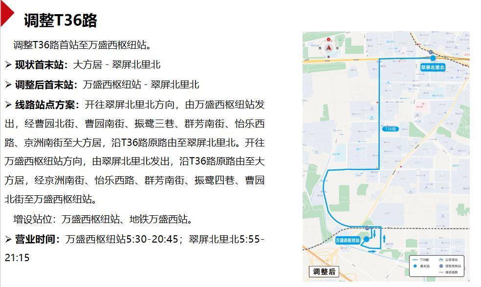 调整T36路首站至万盛西枢纽站。开往翠屏北里北方向,由万盛西枢纽站发出,经曹园北街、曹园南街、振鹭三巷、群芳南街、怡乐西路、京洲南街至大方居,沿T36路原路由至翠屏北里北。开往万盛西枢纽站方向,由翠屏北里北发出,沿T36路原路由至大方居,经京洲南街、怡乐西路、群芳南街、振鹭四巷、曹园北街至万盛西枢纽站。
