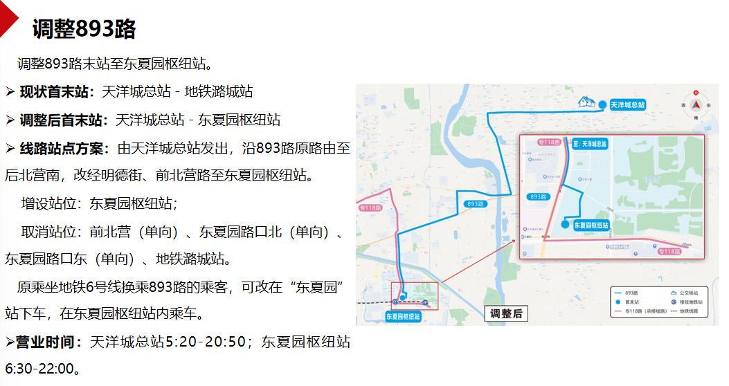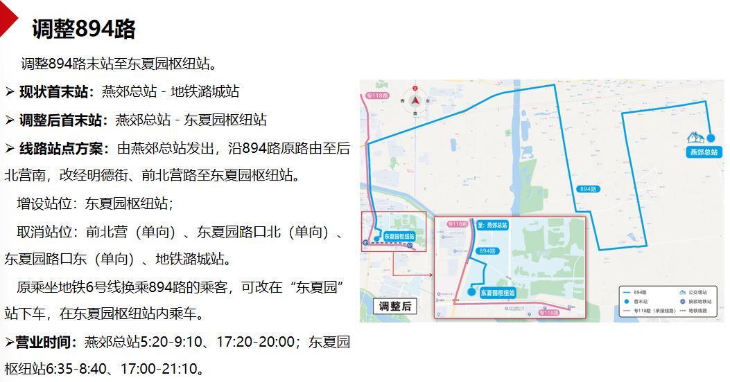 其中,893路、894路的末站都调整至东夏园枢纽站,同时取消前北营(单向)、东夏园路口北(单向)、东夏园路口东(单向)、地铁潞城站。原乘坐地铁6号线换乘893路、894路的乘客,可改在“东夏园”站下车,在东夏园枢纽站内乘车。