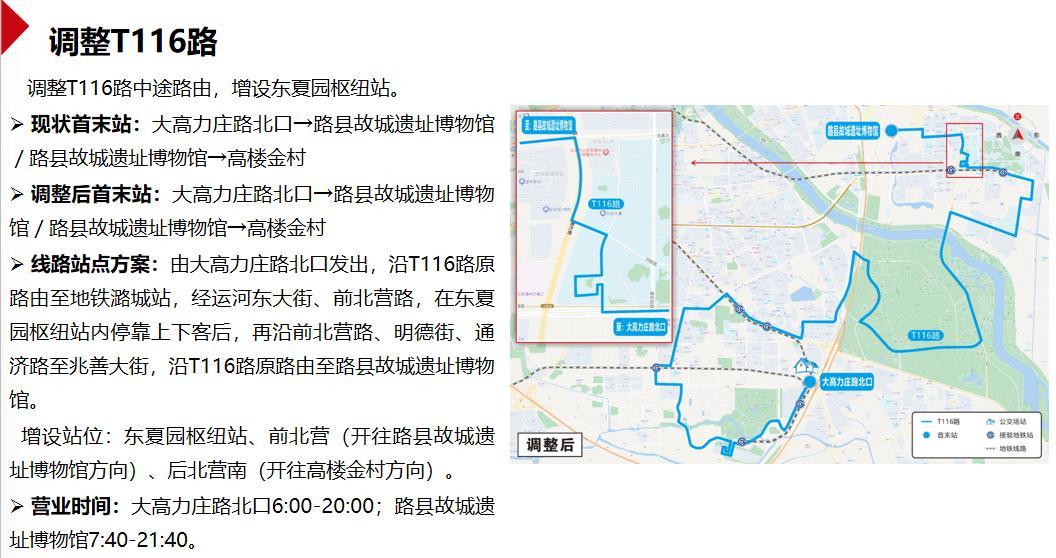 调整T116路中途路由,增设东夏园枢纽站。线路由大高力庄路北口发出,沿T116路原路由至地铁潞城站,经运河东大街、前北营路,在东夏园枢纽站内停靠上下客后,再沿前北营路、明德街、通济路至兆善大街,沿T116路原路由至路县故城遗址博物馆。增设东夏园枢纽站、前北营(开往路县故城遗址博物馆方向)、后北营南(开往高楼金村方向)。