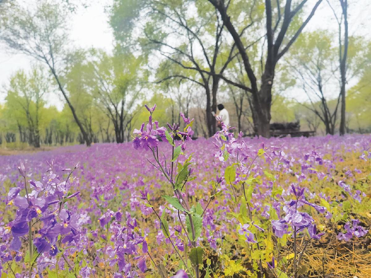 清明节后,北京昌平区东小口镇,奥北森林公园二期,林荫之间铺满盛开的二月兰,三三两两的游客漫步在树荫与鲜花之间。