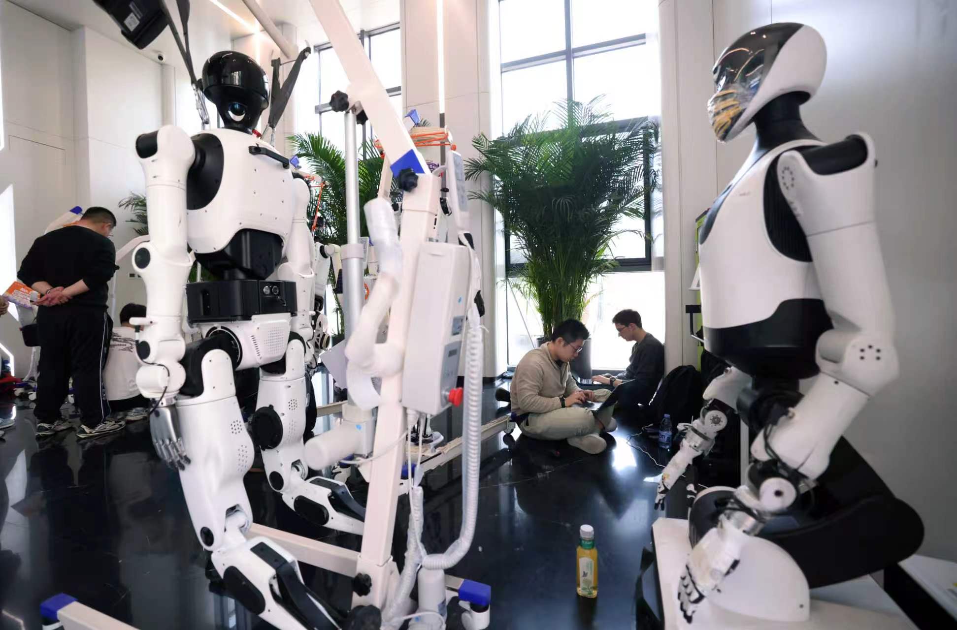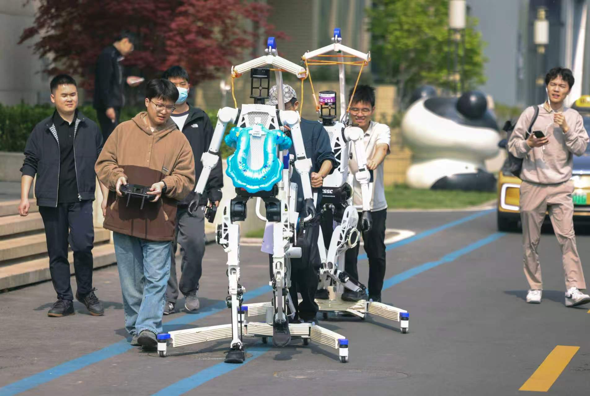 在机器人半马比赛中,除了100多支钢铁“跑者”战队,赛场外,机器人拉拉队、机器人乐队组成的“氛围组”正在进行最后的彩排。