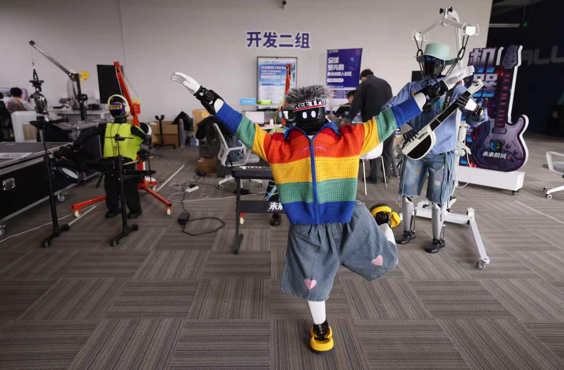 机器人拉拉队训练场地的旁边是机器人乐队,这支队伍也将在机器人半马比赛期间亮相。乐队有主唱、吉他手、键盘手、钢琴手,高矮胖瘦,外形不一,但穿着演出服站在一起,特别和谐。未来机域开发者社区机器人乐队二次开发项目负责人吴怡烨表示,赛场上不仅要有“运动员”,还应该有“氛围组”,“我们乐队的服装是多巴胺配色,表演《阳光彩虹小白马》《北京欢迎你》《不再犹豫》三首曲目,每首都有对应的‘皮肤’。”