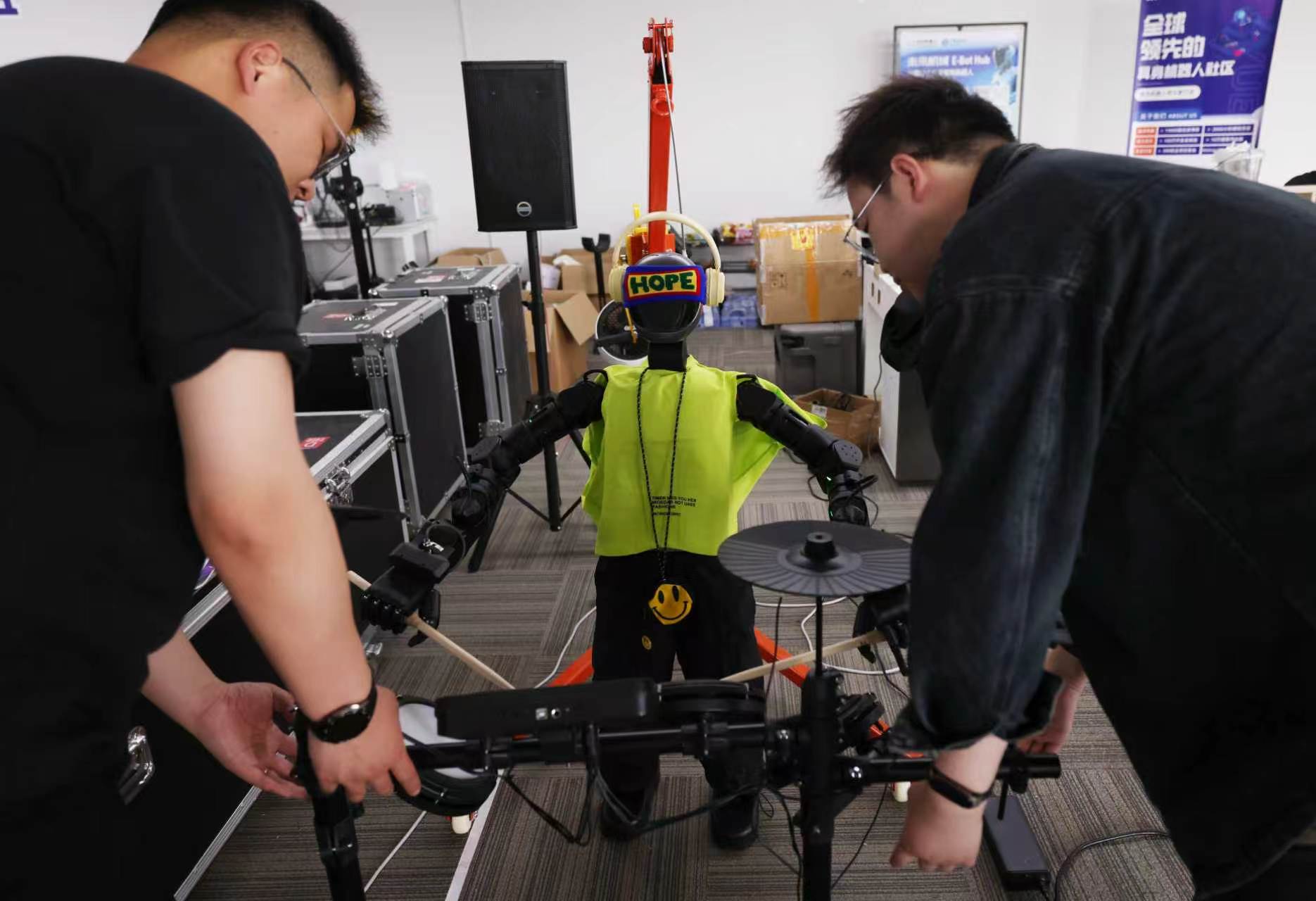 工作人员调试机器人乐手。新京报记者 李木易 摄
