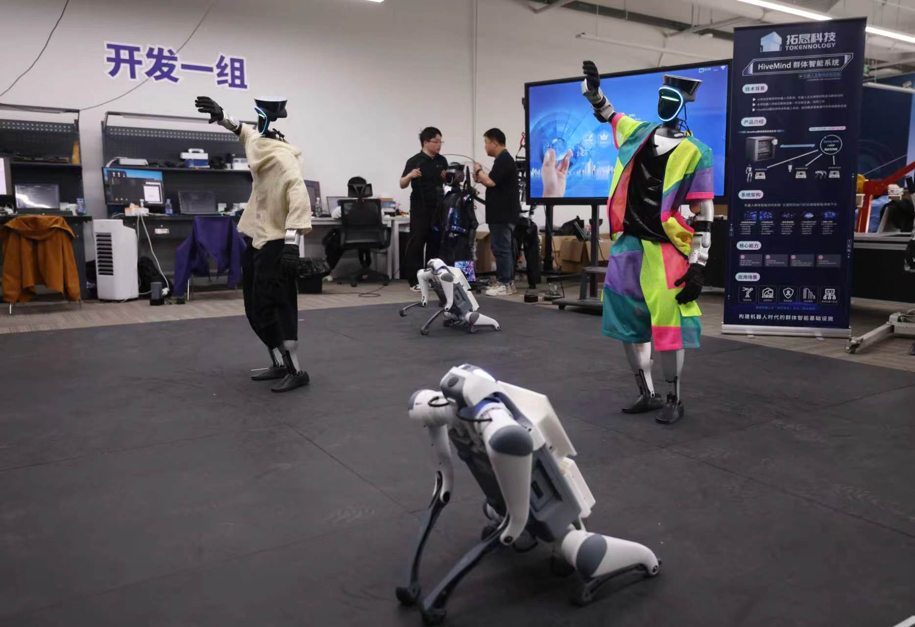 在北京机器人产业园内,“氛围组”的训练一点儿也不轻松。机器人拉拉队的“队员们”穿着时尚的演出服装,在工程师的调教下做出整齐划一的动作。机器人跳舞如今已不新鲜,这支拉拉队新鲜的是,由不同的机器人和机器狗组成,这就给“编舞师”带来不小的挑战。