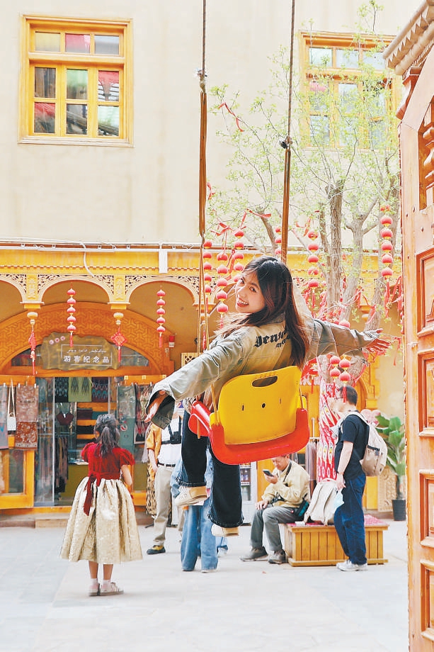 周末午后,新疆和田学院的学生约仁尼莎和同学在团城打卡荡秋千。周边的“阿依旺”式民居建筑是南疆维吾尔族传统民居的典型代表,被列入国家级非物质文化遗产。