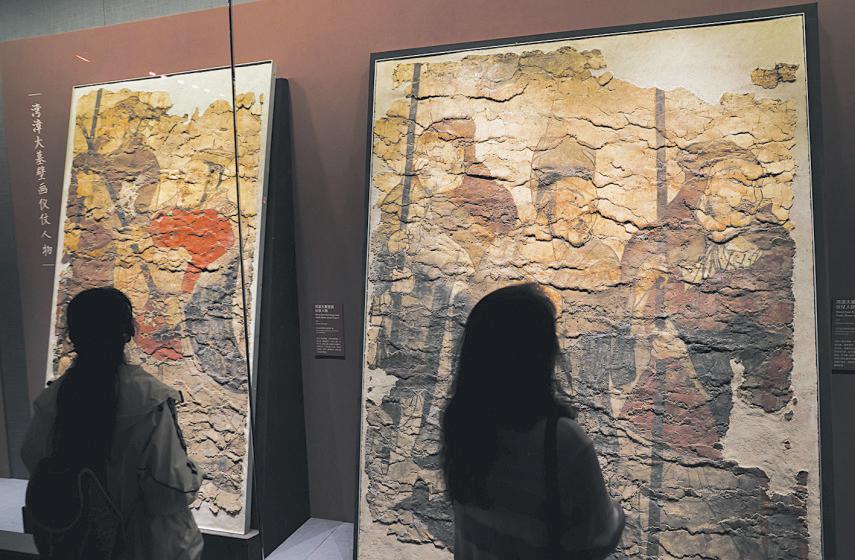 壁画中的仪仗人物是最引人注目的内容,也在此次展览中得以展示。这些人物手执各类武器和仪仗物,或肃立,或作行走状。他们服饰各异,在出土的陶俑中都可找到对应的形象。
