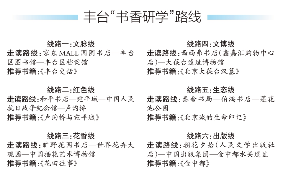 据了解,丰台区图书馆推出6条“书香研学”路线,与丰台区档案馆、中国人民抗日战争纪念馆、世界花卉大观园等多处文博场馆合作,意在以“阅读+文旅”的方式,推动大小读者带着书去旅行。