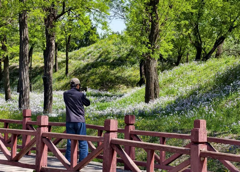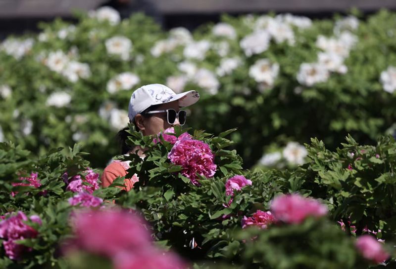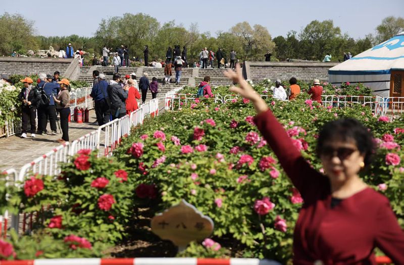 4月20日,圆明园,游客在牡丹前留影。含经堂是园内种植牡丹最多的区域。
