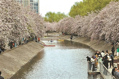 北京市城市河湖管理处土城管理所工作人员李新舟介绍,为保障海棠花溪游船通航,东土城沟河道提前实施了生态补水,根据摇橹船航行需求精准调控河道水位,把水位稳定在0.8-1.2米的安全区间,既满足7艘人工摇橹船的通航要求,又兼顾河道生态与防洪安全,确保水面平稳澄澈,花影相映成趣。此外,北小河经过系统治理,水质显著改善,为樱花水岸、游船通航提供了优良生态环境,成为城区生态治水的典范。