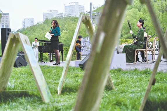启皓大厦矗立在亮马河北岸,大厦河流之间,草坪、垂柳、奇松围出一个小小的河岸剧场。傍晚5点,这场温馨的诗歌会在此启幕。音乐家、歌手、演员、舞蹈家、文化名家及驻华大使等中外嘉宾,围绕“春天、河流、文明”,用不同语言朗诵诗歌。