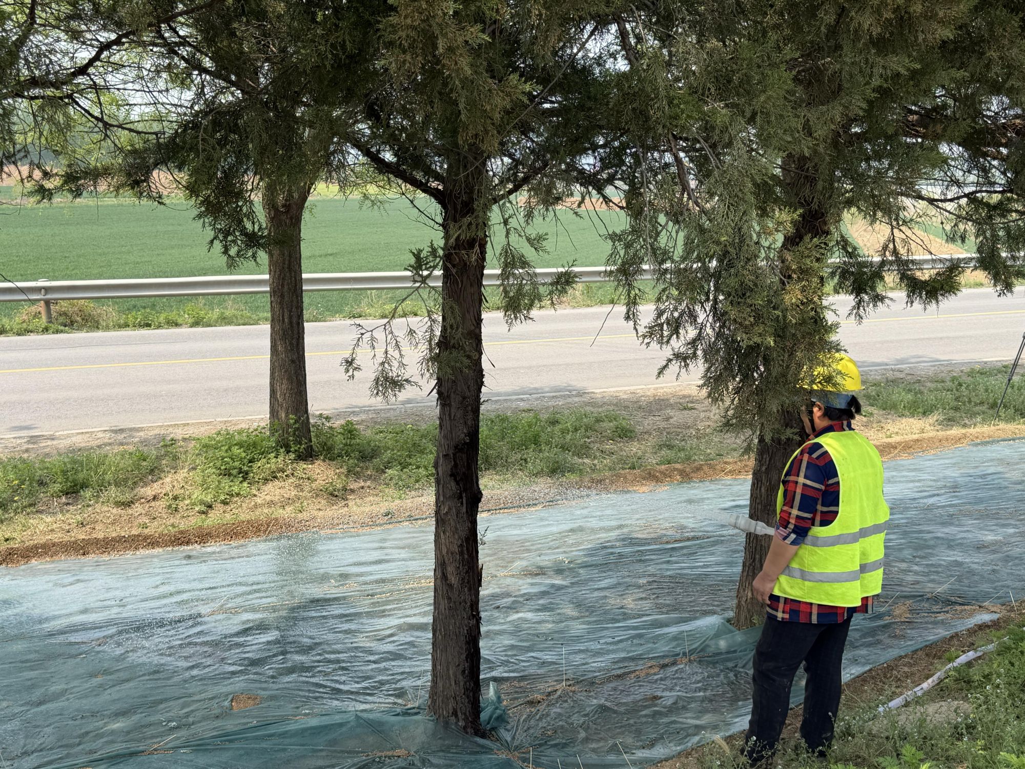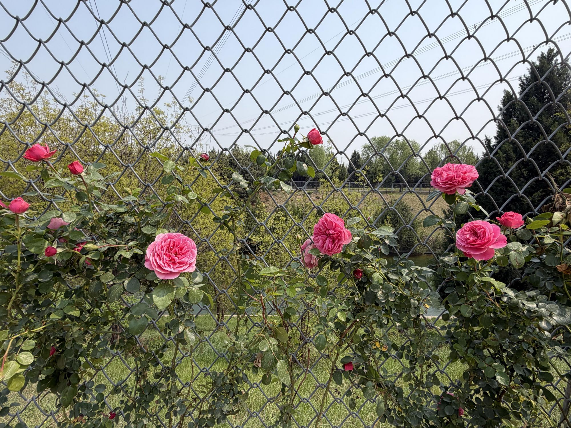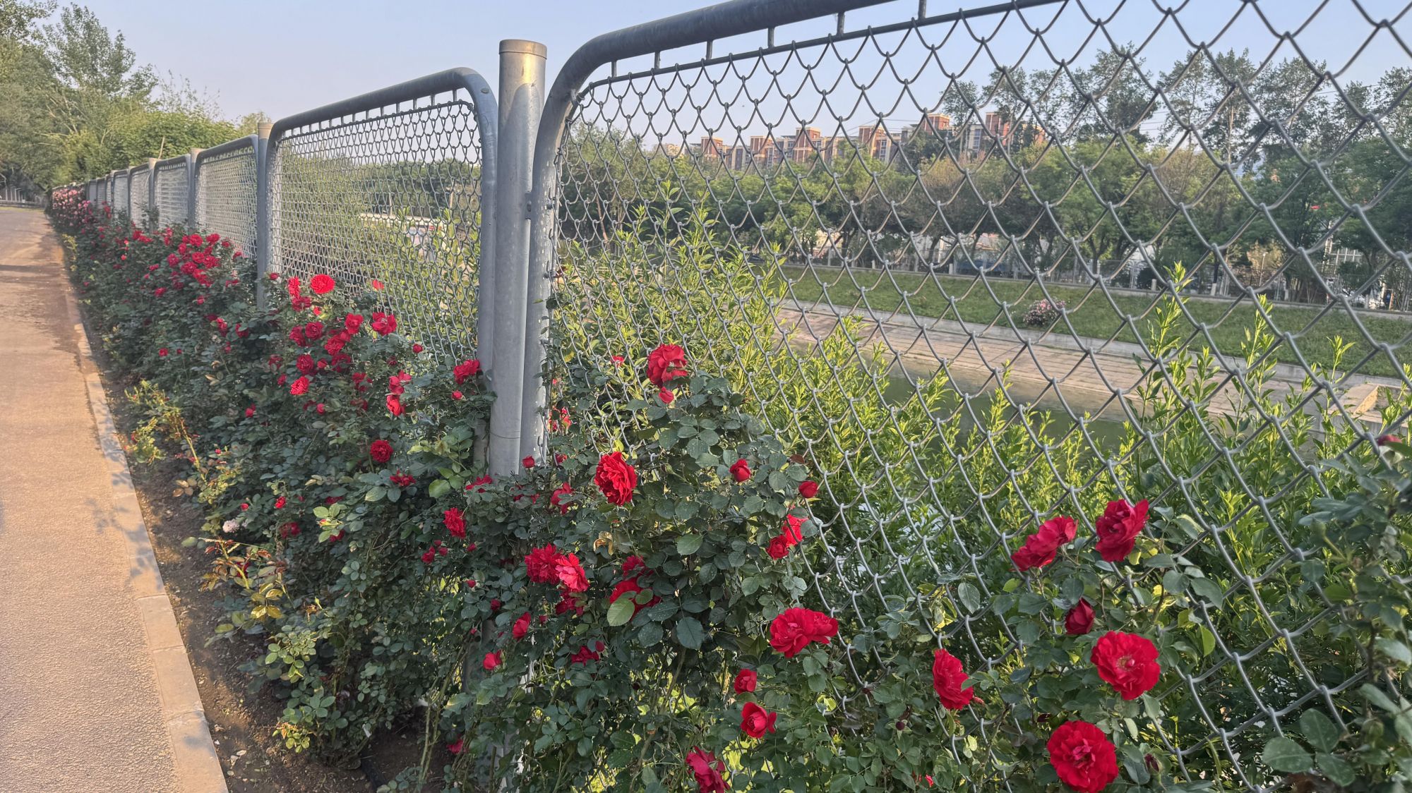 4月23日下午1点多,记者来到京密引水渠李家史山段巡河路,只见金属隔离护网上,绿色藤蔓顺着网格攀缘生长,几朵月季、蔷薇花明艳动人,有的粉红、有的橙黄,呈现出旺盛的生命力。透过护栏,可以看见水渠中清水流淌。岸边,几位工作人员扯着圆鼓鼓的水管,为这些花浇水。不远处,还有工人向土地中播撒花种、修剪造型。