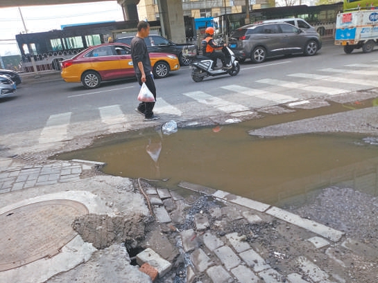 市民告诉笔者,污水外溢情况已经有一两年时间,却一直未能得到处置。大家猜测是因为道路下方的管道出现了损坏,导致污水渗出,由于此处地势较低,污水便在这里积存。积水最多时能没过马路牙子,深度能达到十几厘米。笔者在现场看到,污水旁边有一个污水井,井盖边的路面及地砖由于长期浸泡已经严重塌陷破损。井盖旁还被人凿了一个窟窿,附近熟悉情况的人说,当污水太多时,就能顺着这个窟窿流入污水井,这也算是一种应急措施。