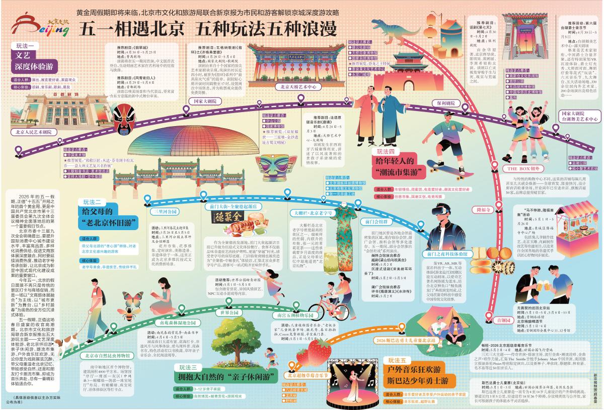 五一假期,正值这场春日盛宴的收官高潮期。北京市文化和旅游局联合新京报推出五大游玩主题——文艺深度体验游、老北京怀旧游、亲子休闲游、潮流市集游、户外音乐狂欢游,无论你是为戏剧展览沉醉、带父母重温老北京记忆、带娃感受自然,还是和朋友打卡潮流市集,抑或为音乐奔赴,总有一番精彩体验适合你。