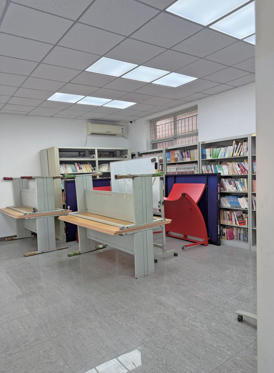这间图书室并非单独、封闭的区域,而是位于文化室走廊过道旁的开放空间,占地约有20平方米,三面墙摆满了一人多高的书架,书架中间的空间摆放着摞在一起的座椅板凳和乒乓球案,也把部分书架挡了个严严实实。