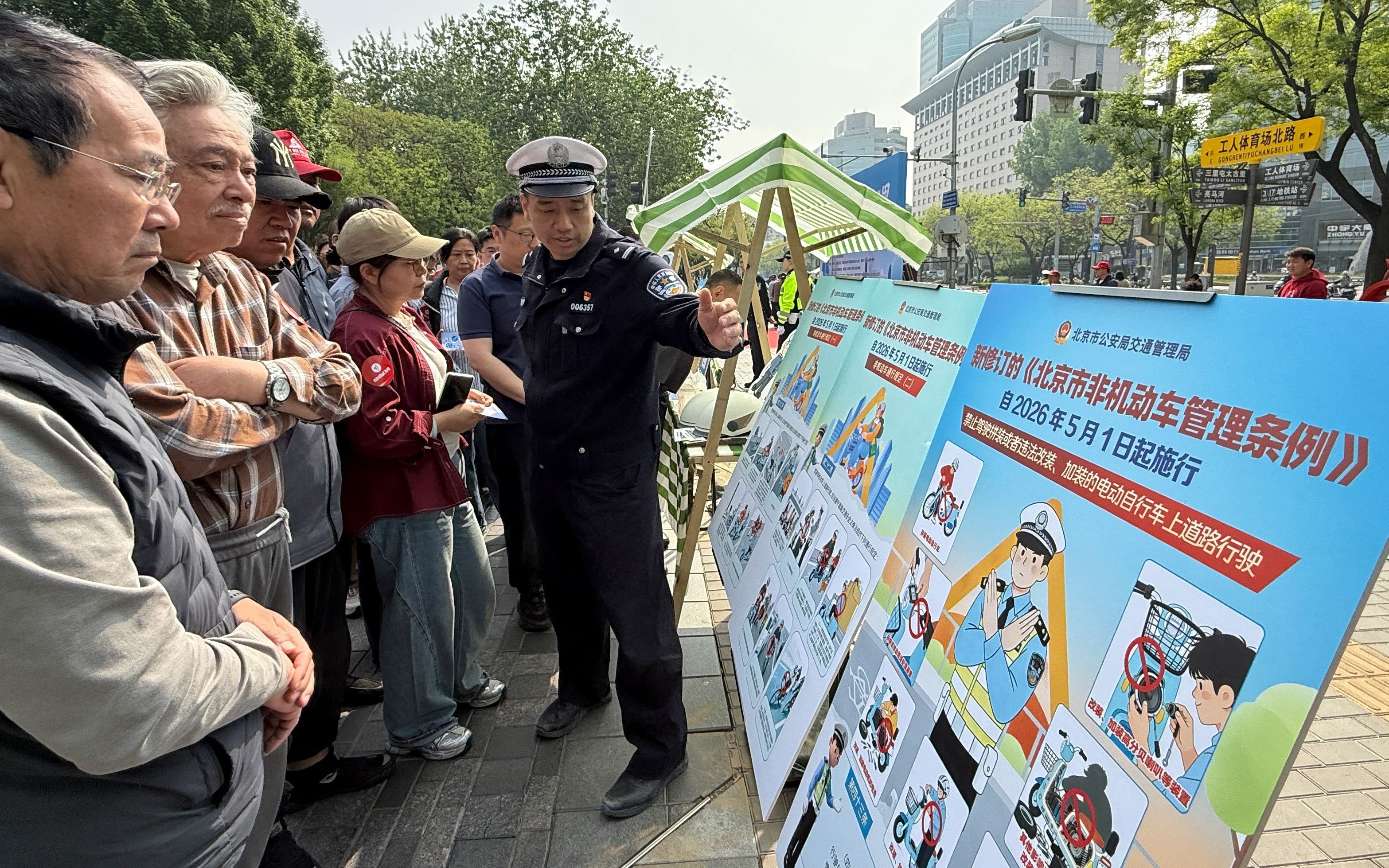 4月24日上午,朝阳交通支队在三里屯街道开展《北京市非机动车管理条例》的普法宣传活动。新京报记者 王贵彬 摄