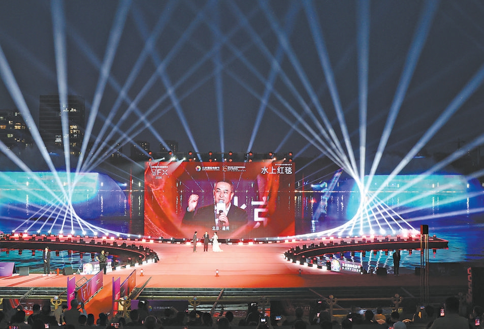 昨晚(24日),大运河畔灯光璀璨。第十六届北京国际电影节通州分会场在北京艺术中心和运河西岸启幕。一条3.3公里的“水上红毯”——5艘主题游船,载着嘉宾踏波而行,在水光夜色中驶向码头。